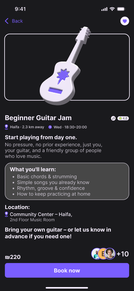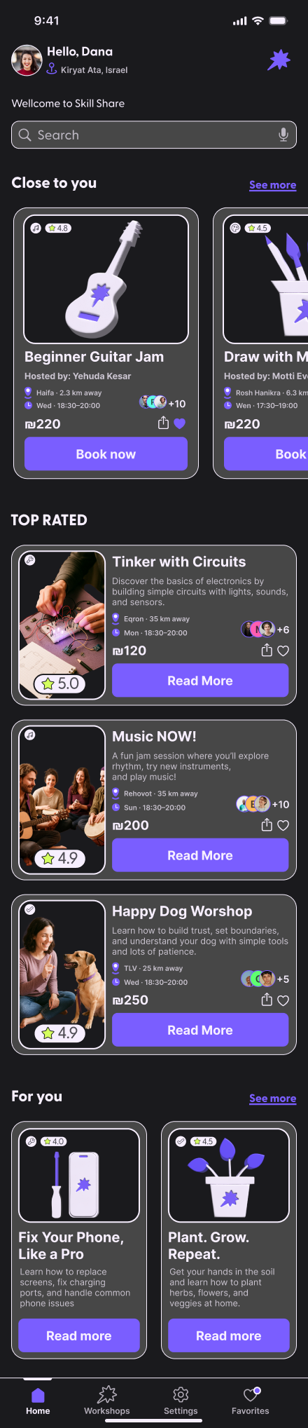 As part of a practical exam in interactive media design, I was tasked with designing a full brand identity and UX/UI experience for a community-based learning app. The challenge included creating a concept, logo, visual language (online and offline), and designing key screens for mobile – such as onboarding, home, workshop discovery, personalized recommendations, and workshop details.